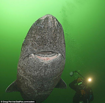 格陵蘭島 巨型深海鯊魚 壽命 200年巨型深海鯊魚。一名海底攝影師最近在格陵蘭島附近海域發現一種罕見的巨型鯊魚,外形酷似被腐蝕的岩石。該種鯊魚以海豹等為食物,有時還捕殺北極熊。